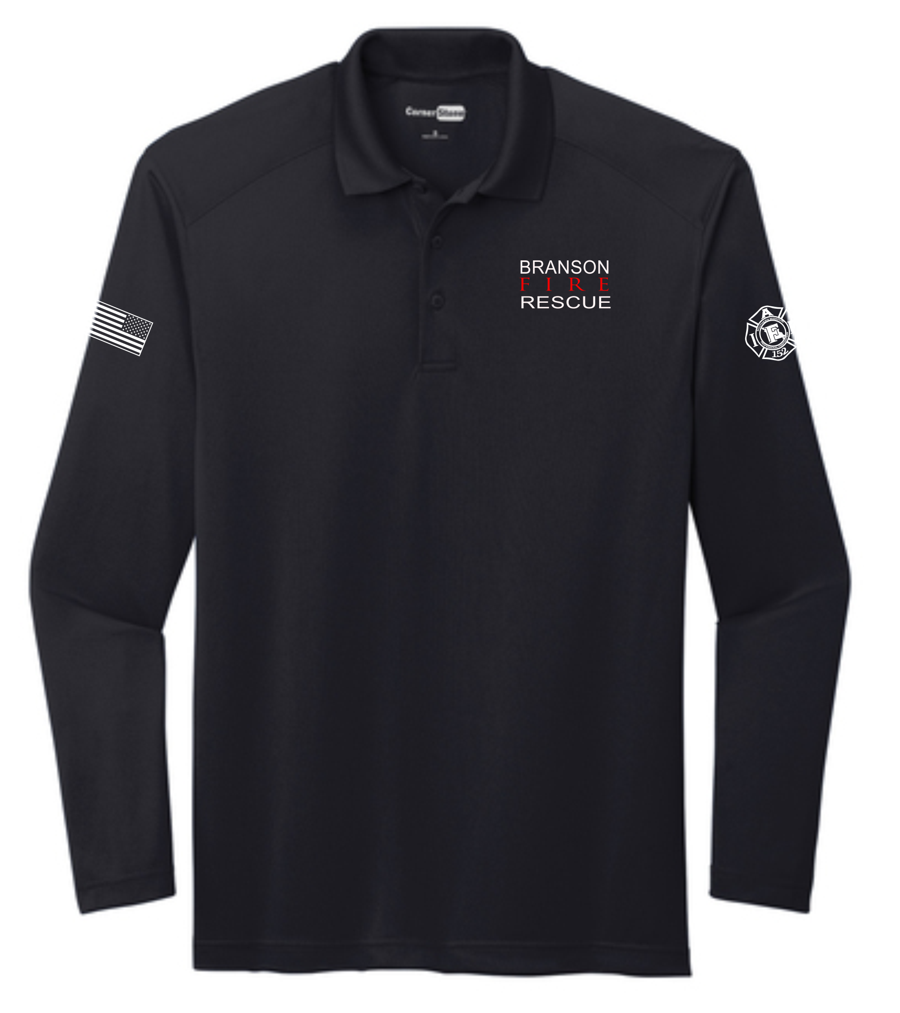 Polo will be embroidered with the Branson Fire Rescue logo on the left chest, IAFF Local 152 logo on the left sleeve, and flag on the right sleeve