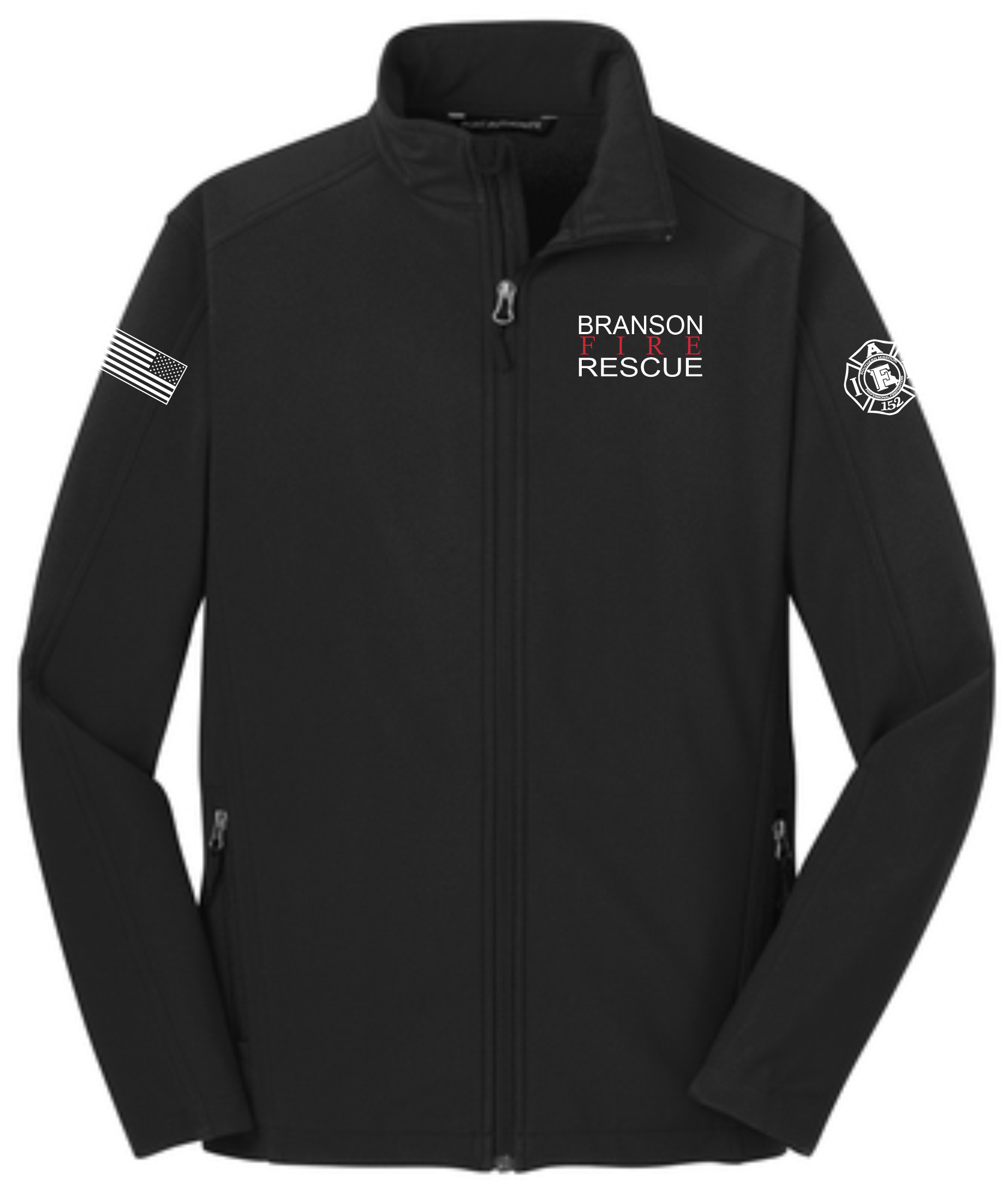 Job shirt will be embroidered with the Branson Fire Rescue logo on the left chest, flag on the right sleeve, and BFR Maltese logo on the left sleeve.