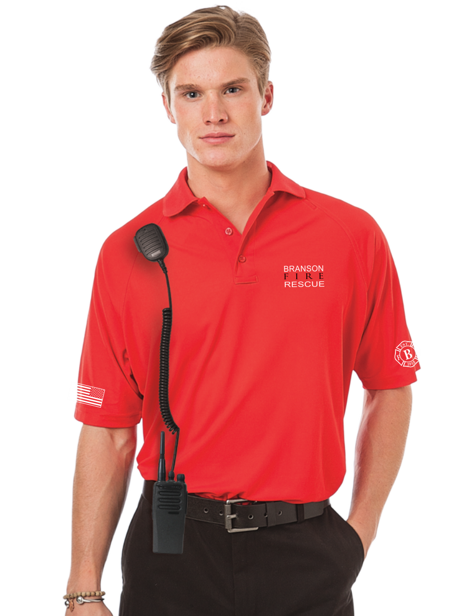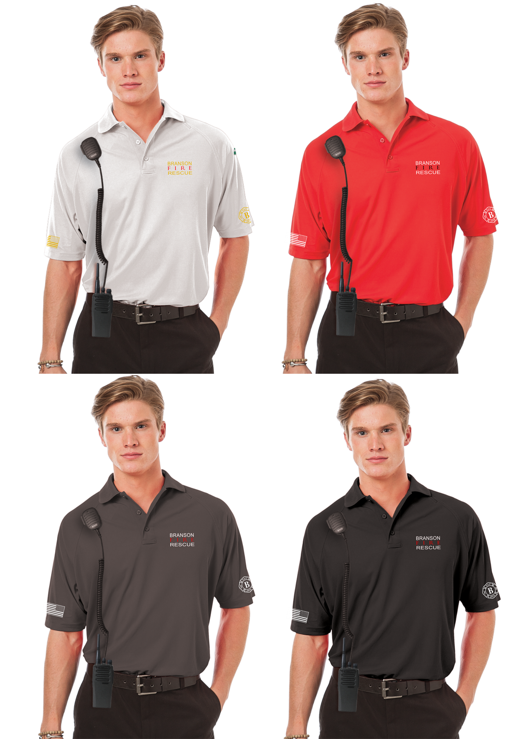 Polo will be embroidered with the Branson Fire Rescue logo on the left chest, BFR maltese logo on the left sleeve, and flag on the right sleeve
